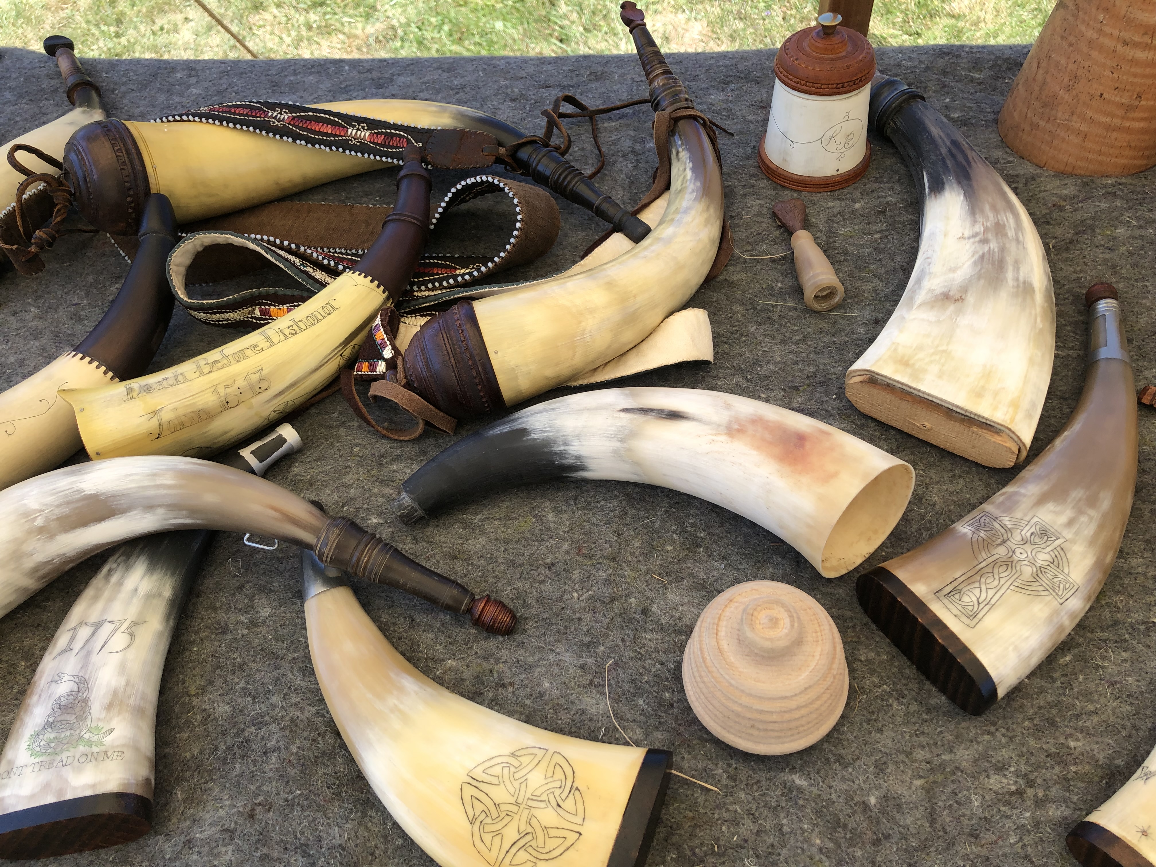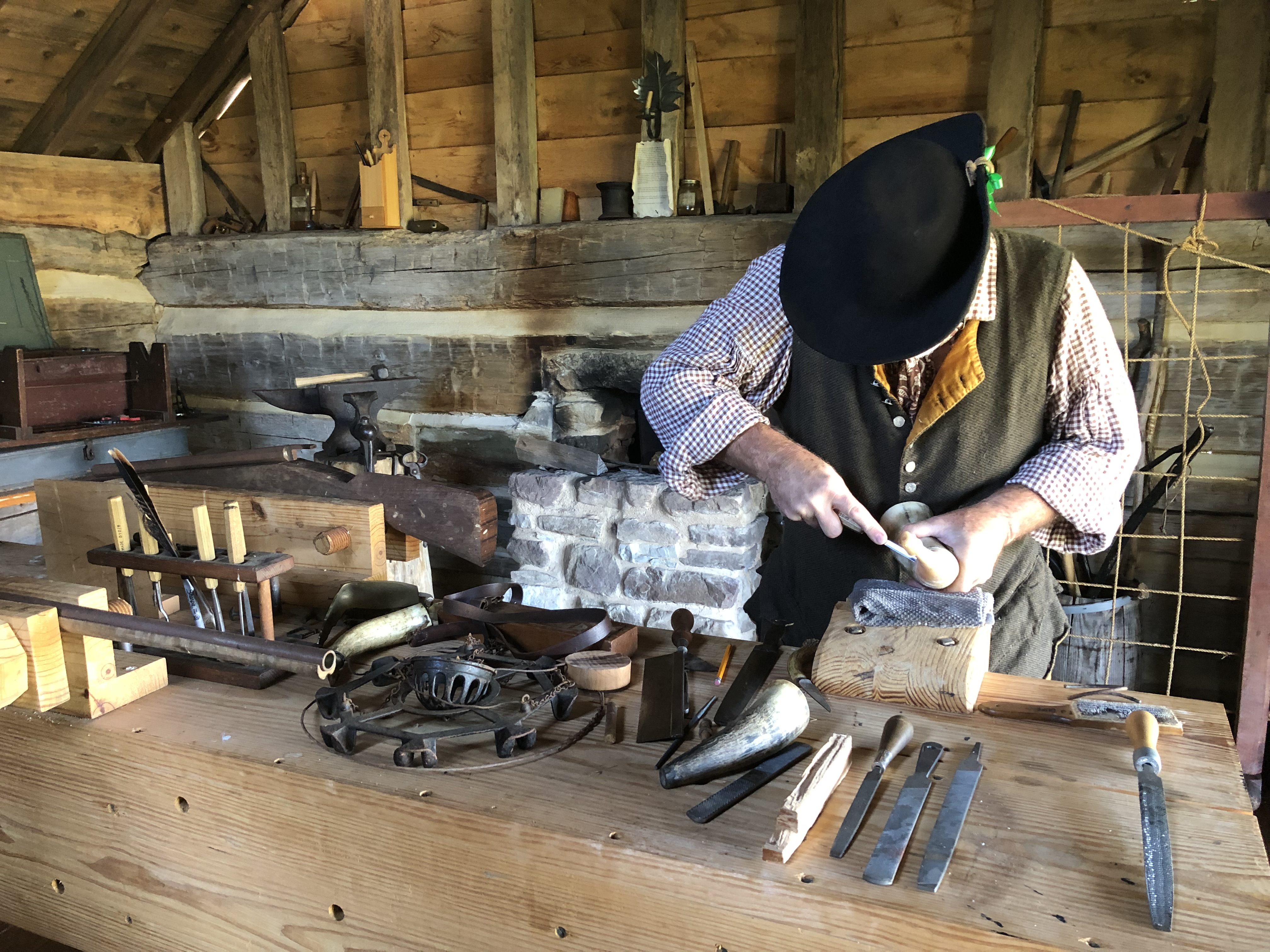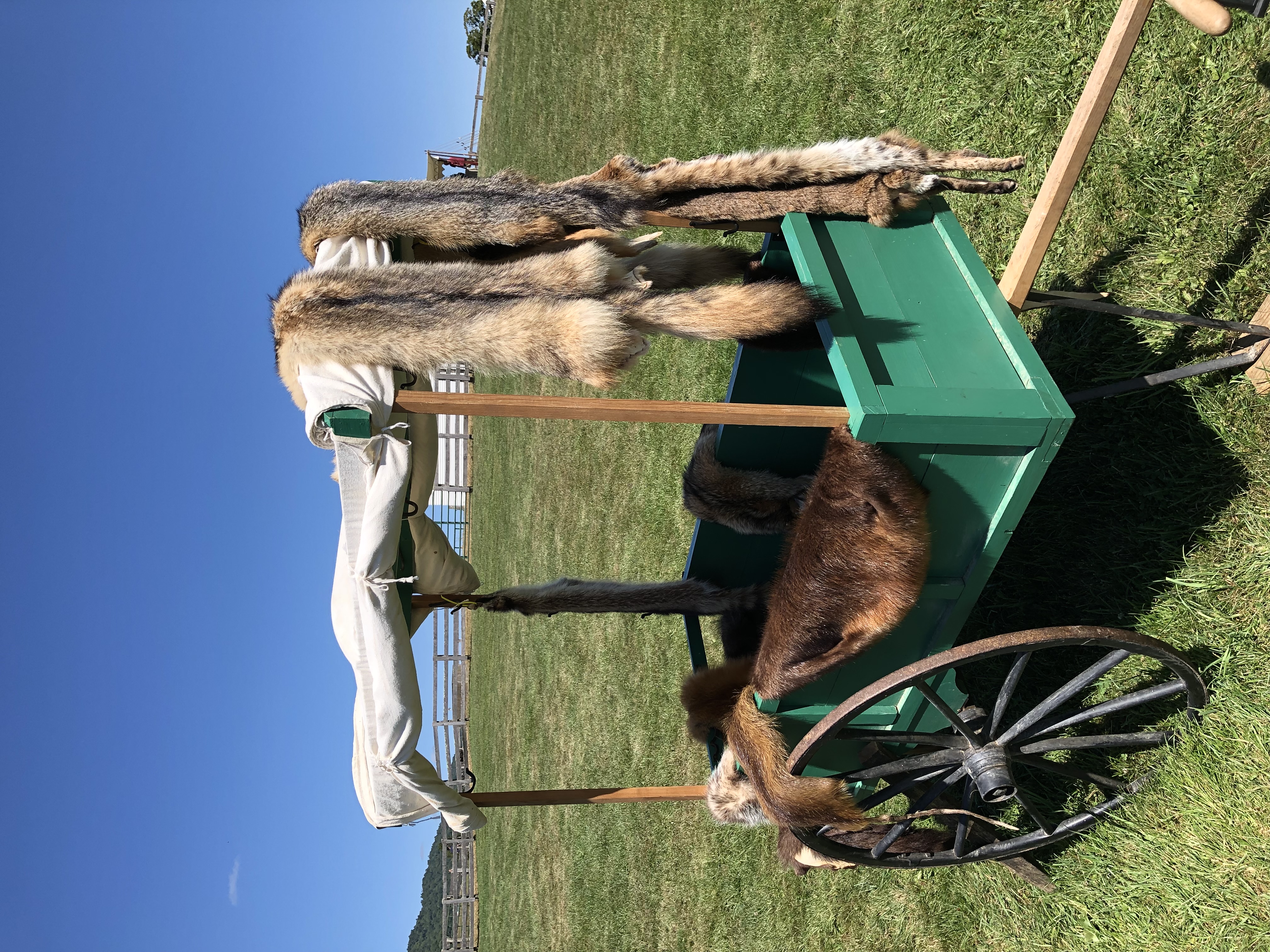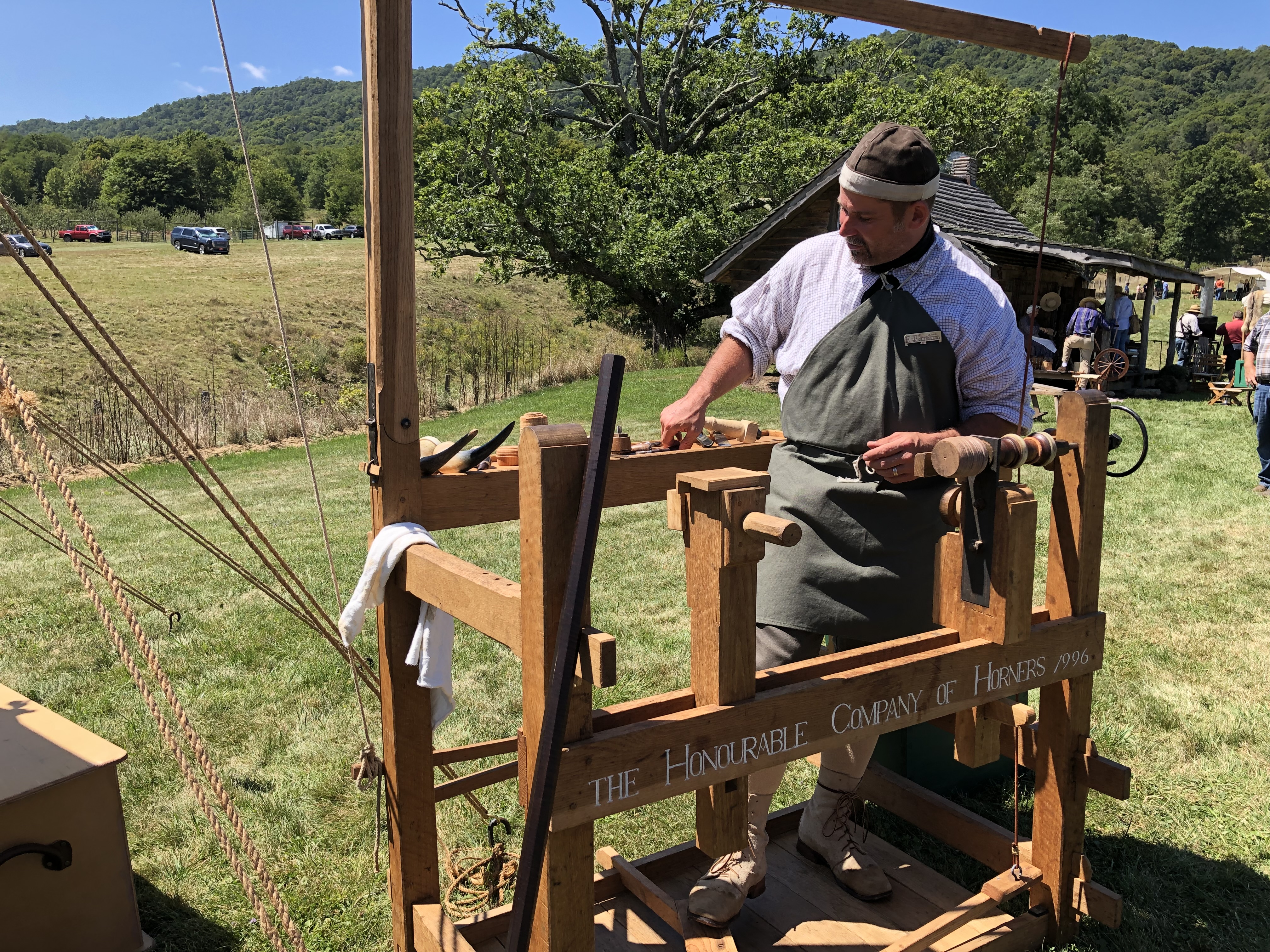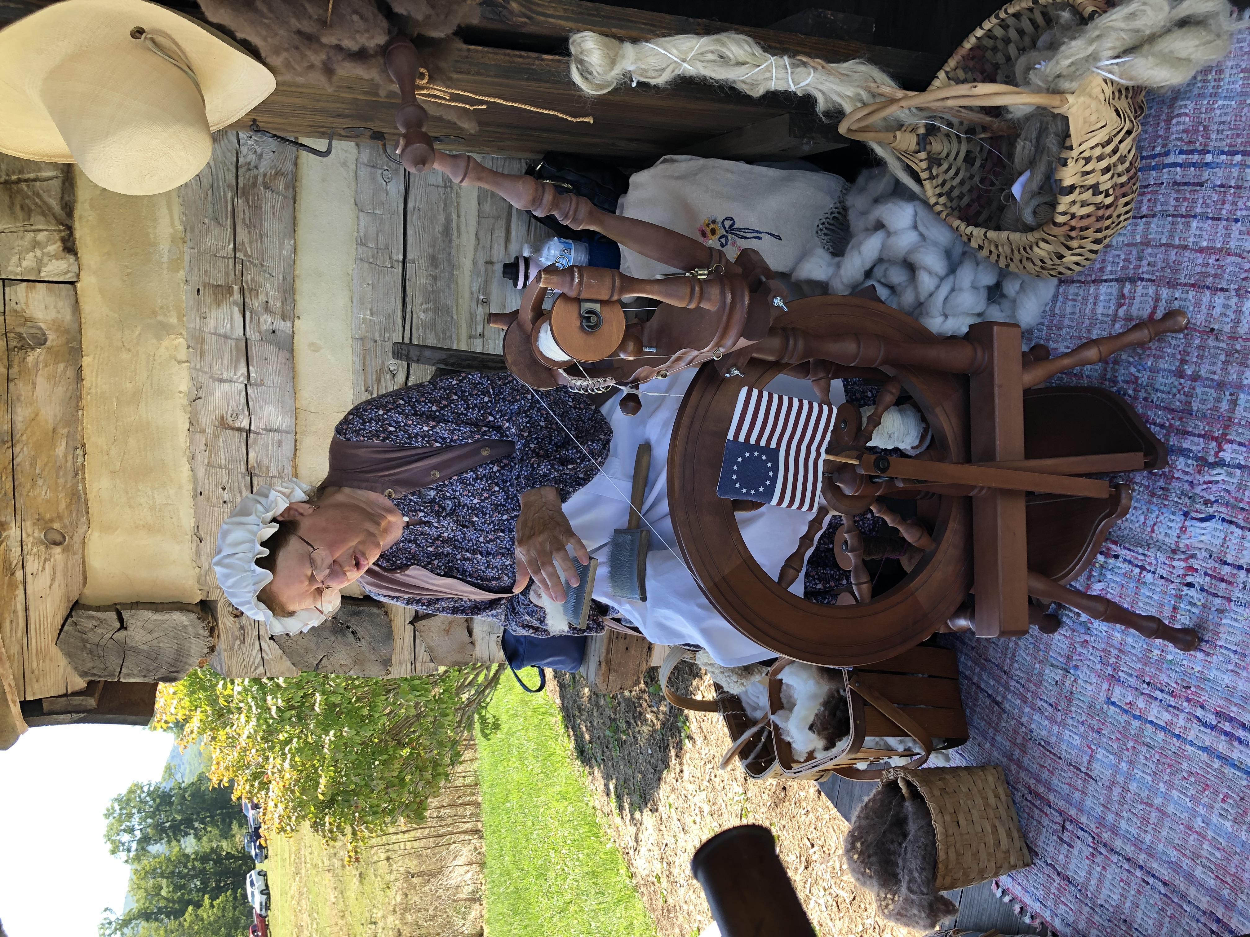 On Saturday we went to a 18th Century Trade Fair at Fair Lawn Farm in Monterey, VA. They had people there representing different trades. They had some horners, someone spinning wool, a blacksmith, and some other interesting things. They had food sold by the local Amish. People were dressed in period dress. The peddler gave us a magazine of a period clothing seller called Townsends. Some of the outfits cost around $1,000!