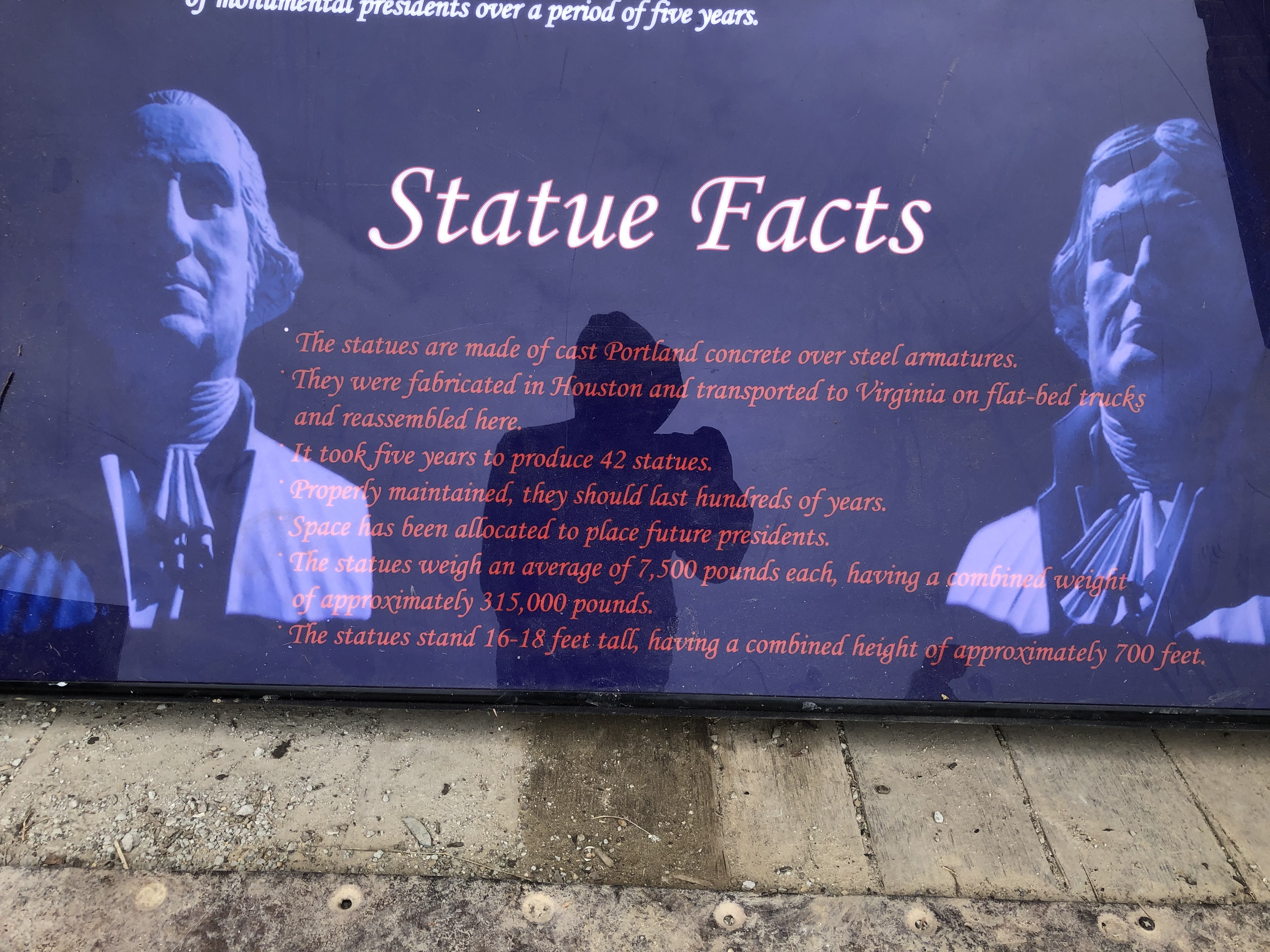 President’s Heads We went to see the President‘s Heads in Croaker, VA. It is a bunch of old statues of all the presidents through George W. Bush. All the statues are 15-20 ft. tall and weigh about 7,500 pounds. The website can be found here.